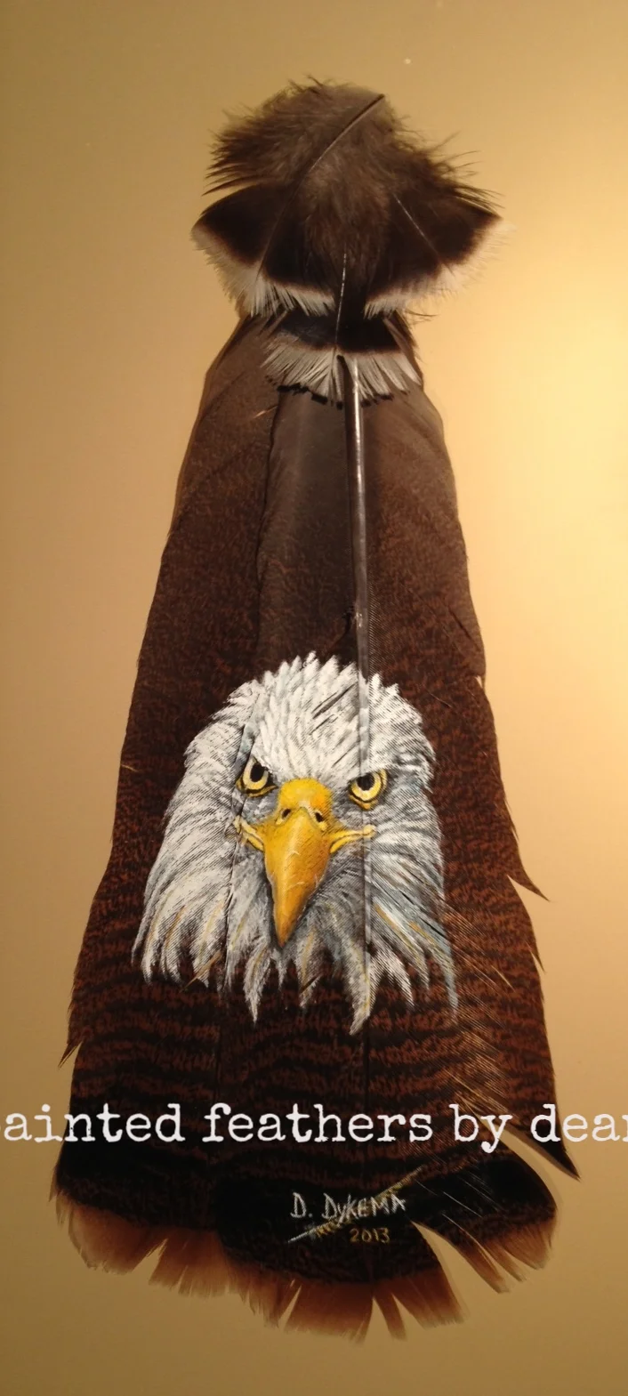 If this doesn't say "American!" I don't know what does! The flag appears to be war torn because of the condition of the individual barbules within the feather, yet the eagle remains defiant! Painted on two wild Eastern Turkey tail feathers. The base of the shafts are adorned with body feathers. The feathers are matted and framed in a shadow box.