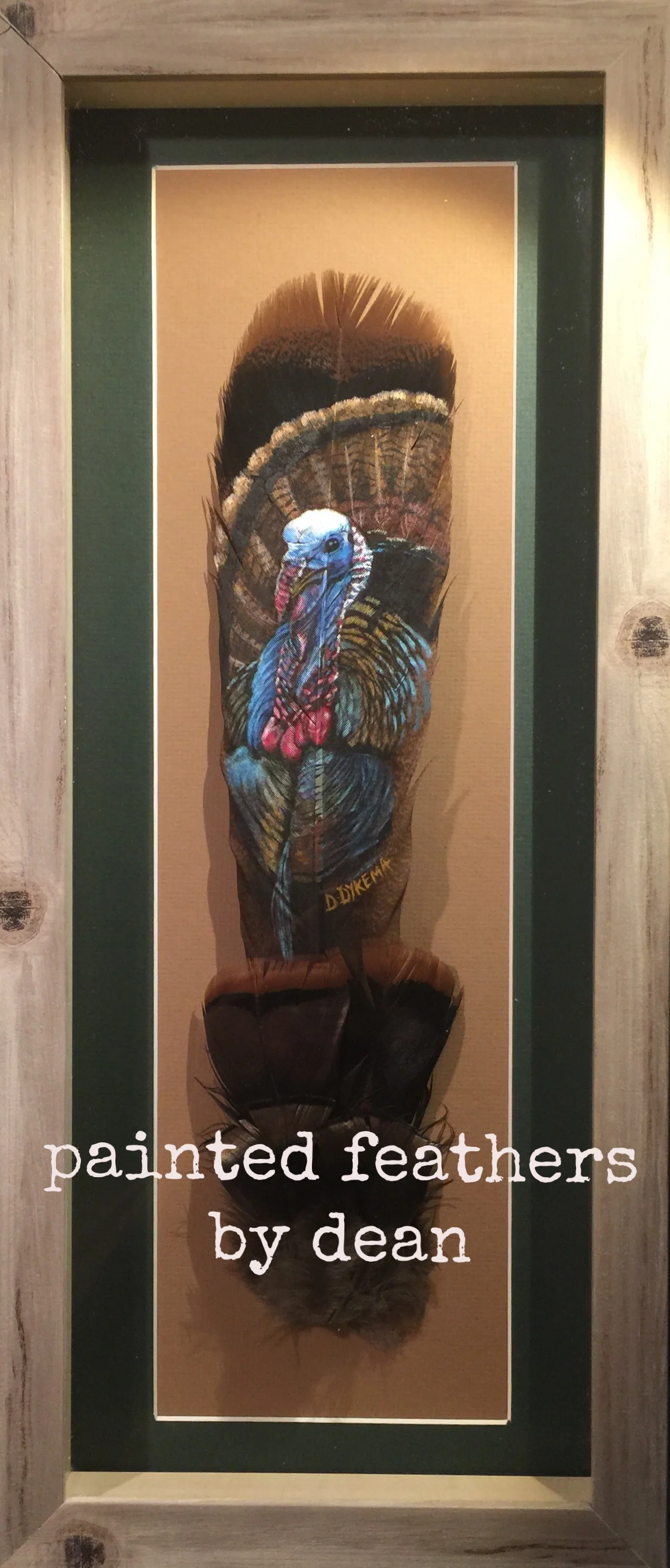 The customer who ordered this asked for a painting that represented his love for turkey hunting, deer hunting, and his Harley Davidson. This is the design I came up with, painted on three wild Eastern Turkey tail feathers. The shafts are adorned with body and covert feathers. The feathers are matted and framed in a shadow box.