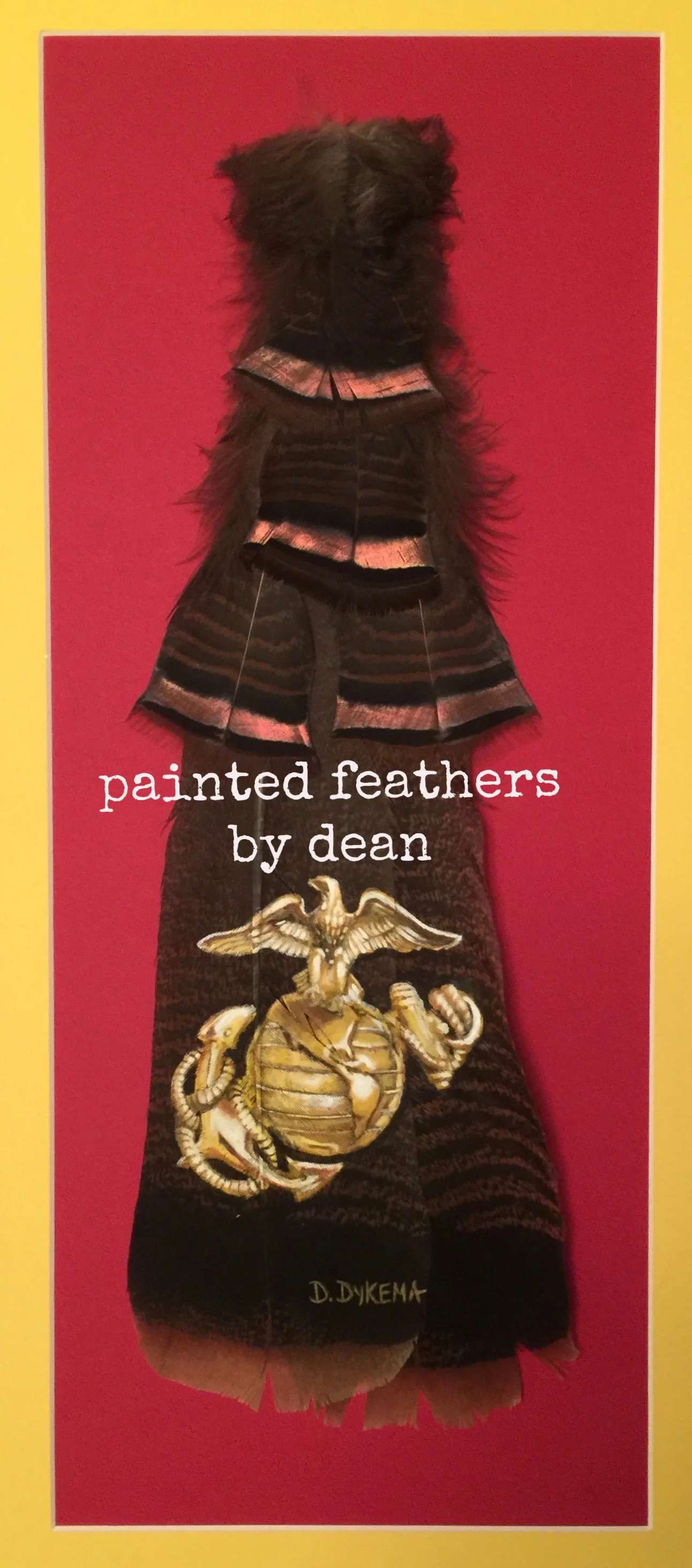 This is the United States Marine Corps' enlisted emblem, painted on two wild Eastern Turkey tail feathers. The shafts are adorned with body and covert feathers. The feathers are matted and framed in a shadow box.