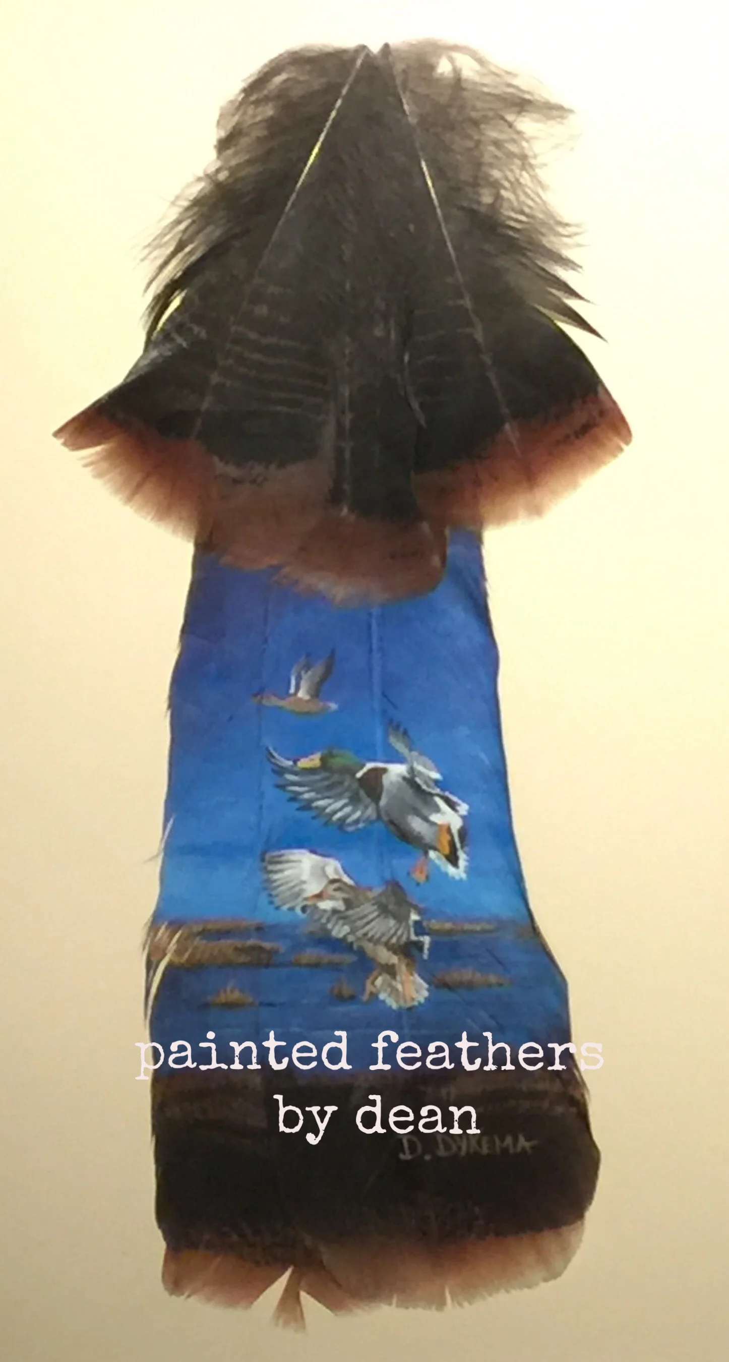 These Mallard ducks have found a quiet spot in a Minnesota slough. They are painted on two wild Eastern Turkey tail feathers. The shafts are adorned with body and covert feathers. The feathers are matted and framed in a shadow box.