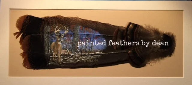 This Whitetail buck is making early morning rounds, looking for sign in the new fallen snow. Painted on two wild Eastern Turkey tail feathers. The base of the shafts are adorned with body and covert feathers. The feathers are matted and framed in a shadow box.