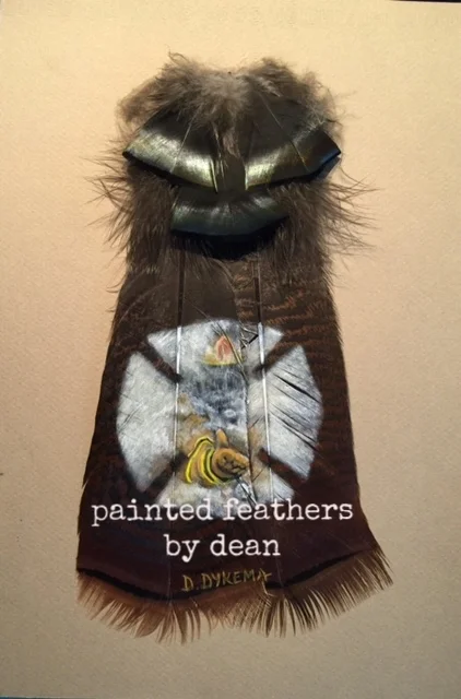 This firefighter has set aside his fears and has taken a certain level of risk to extend a helping hand. Painted on two wild Eastern Turkey tail feathers. The base of the shafts are adorned with body and covert feathers. The feathers are matted and framed in a shadow box.