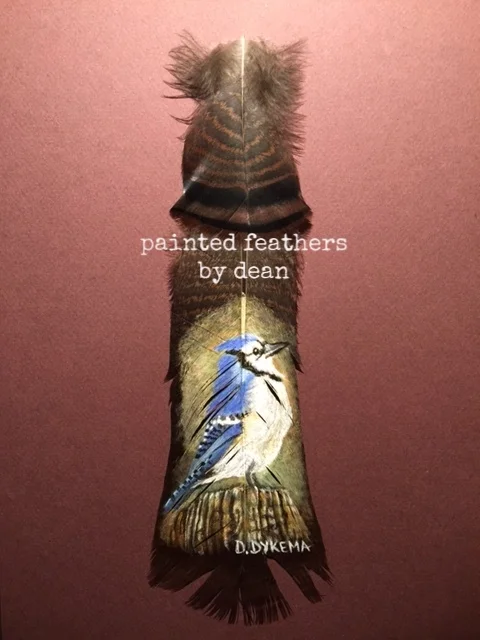 This little bluejay has found his stage, and is trying to give his best performance. Painted on one wild Eastern Turkey large covert feather. The base of the shaft is adorned with a smaller covert feather. The feathers are matted and framed in a shadow box.