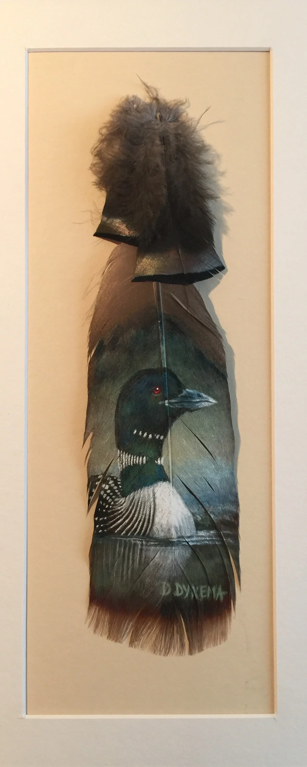 This loon is painted on one covert feather and adorned with body feathers. The feather was then matted and placed in a shadow box.