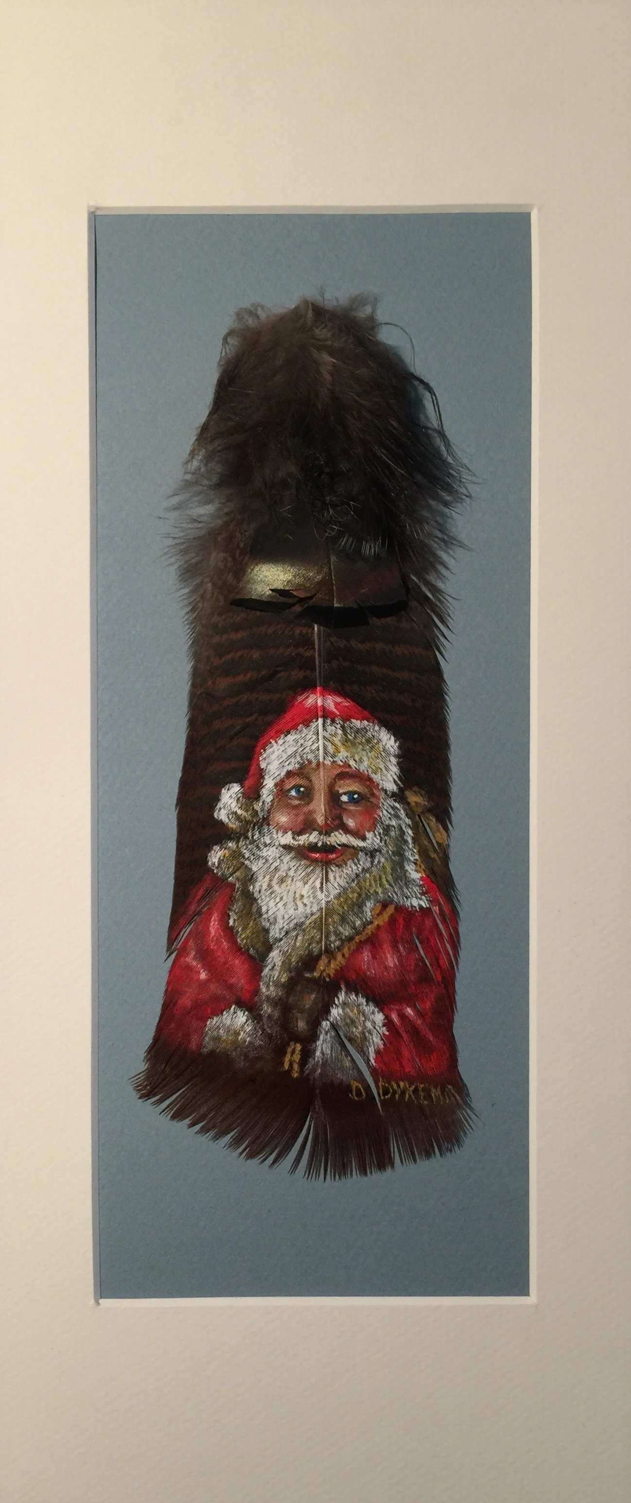 This commissioned Santa Claus is painted on one covert feather and adorned with body feathers. The painting was then matted, and placed in a shadow box.