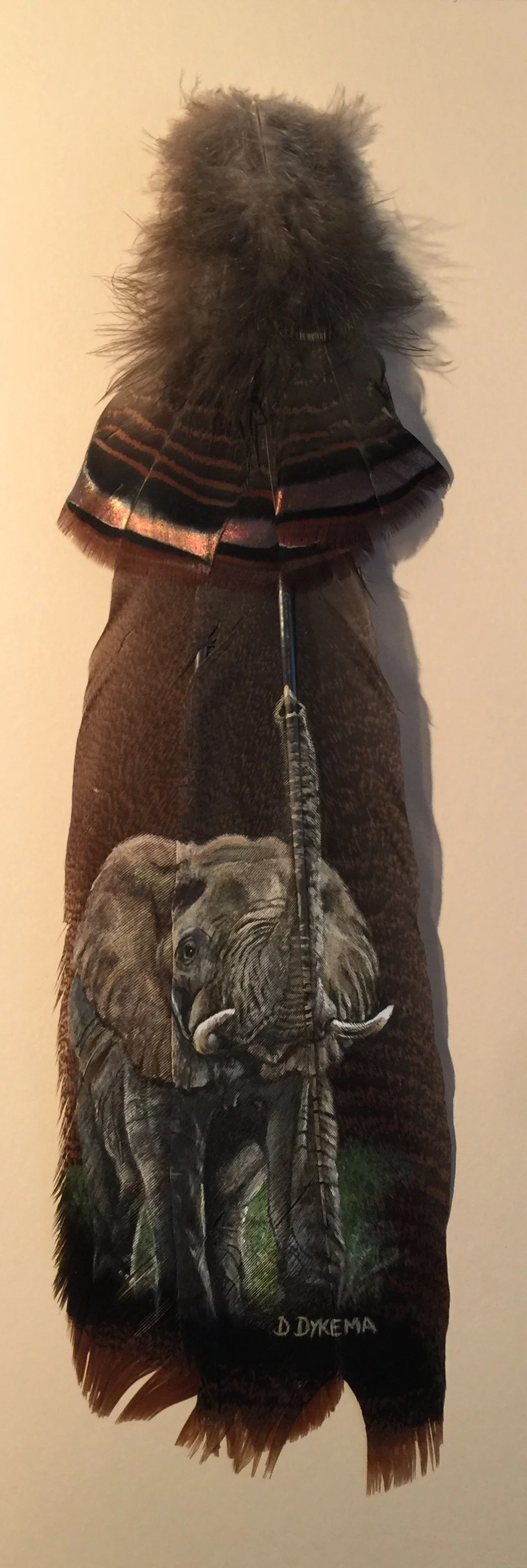 This is an acrylic painting of an African Elephant with raised trunk, painted on two wild Eastern Turkey tail feathers. The base of the shafts are adorned with body and covert feathers. Some say if the trunk is up the elephant will shower good fortune on all who walk past it. The feathers are matted and framed in a shadow box.