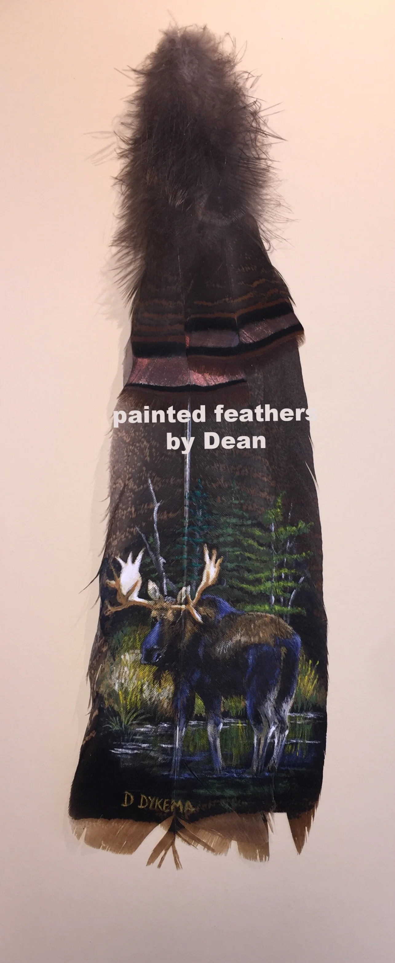 This is an acrylic painting of a Moose, standing in a pond, painted on two wild Eastern Turkey tail feathers. The base of the shafts are adorned with body and covert feathers. The feathers are matted and framed in a shadow box.