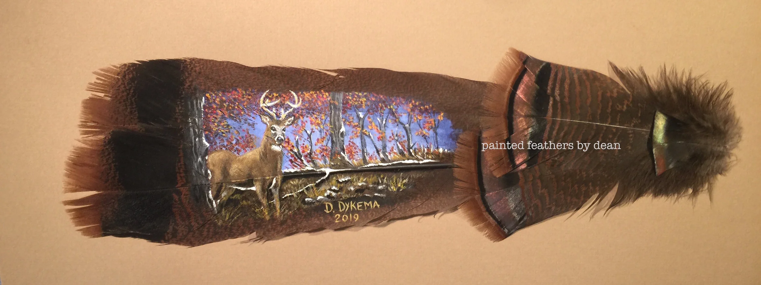 This is an acrylic painting of a Whitetail buck making his rounds through the woods, warmed by the morning sun. Painted on two wild Eastern Turkey tail feathers. The base of the shafts are adorned with body and covert feathers. The feathers are matted and framed in a shadow box.