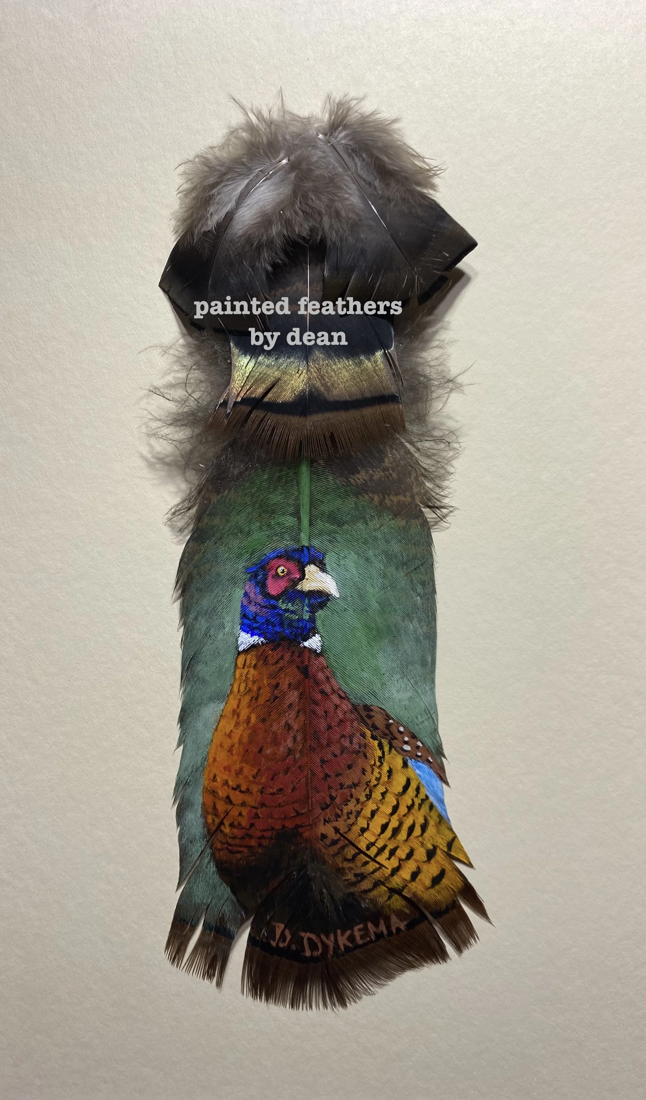 This is a close up portrait of a rooster Ring Neck Pheasant, painted on one wild Eastern Turkey tail feather. The shaft of the feather is adorned with body and covert feathers. The feathers are matted and framed in a shadow box.